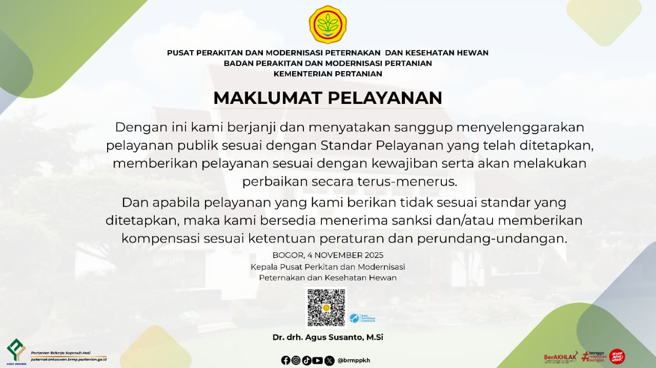 Sebagai pelayanan publik, BRMP PKH berkomitmen menyelenggarakan pelayanan sesuai standar dan peraturan perundang-undangan. BRMP PKH memastikan setiap masyarakat dapat memperoleh layanan dengan mudah dan cepat. Komitmen ini tidak hanya menunjukkan dedikasi BRMP PKH dalam melayani masyarakat, tetapi juga menjadi cerminan dari upaya untuk meningkatkan kualitas layanan publik di sektor pertanian, termasuk peternakan dan kesehatan hewan didalamnya.