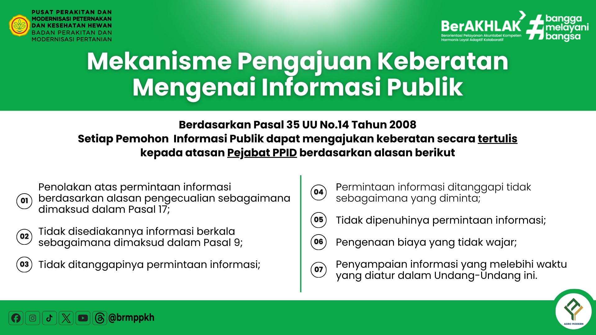 Setiap pemohon informasi publik dapat mengajukan keberatan secara tertulis kepada atasan Pejabat Pengelola Informasi dan Dokumentasi dengan alasan sebagaimana ditetapkan dalam pasal 35 Undang-Undang Nomor 14 Tahun 2008. Keberatan diajukan oleh Pemohon Informasi Publik dalam jangka waktu paling lambat 30 (tiga puluh) hari kerja setelah yang bersangkutan menemukan alasan keberatan.